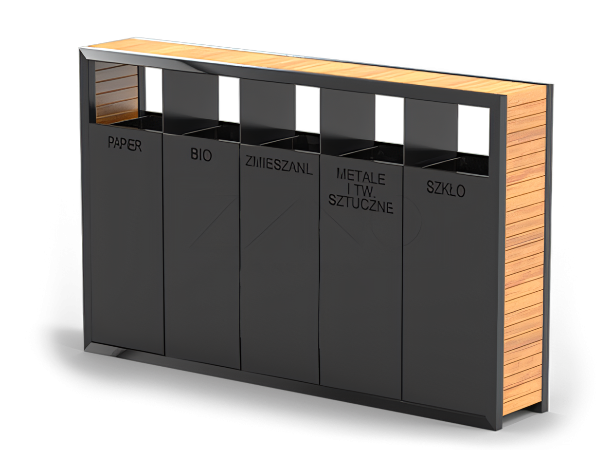 "Pavo" šiukšliadėžė yra 5 segmentų populiarios miesto šiukšliadėžės versija. Išplėtę šiukšlių dėžę iki 5 kamerų, atitinkame naujausius atliekų rūšiavimo politikos reikalavimus. Kiekviena kamera paeiliui skirta popieriaus ir kartono, metalų ir plastiko, stiklo, biologinėms ir mišrioms atliekoms. Krepšelio pagrindo versija pagaminta iš nerūdijančiojo plieno ir egzotinės medienos. Galima užsisakyti krepšį iš anglinio plieno, cinkuoto ir dažyto milteliniu būdu, taip pat iš eglės arba pušies medienos (vietinė mediena yra lakuota). Medieną galima pakeisti HPL laminatu.