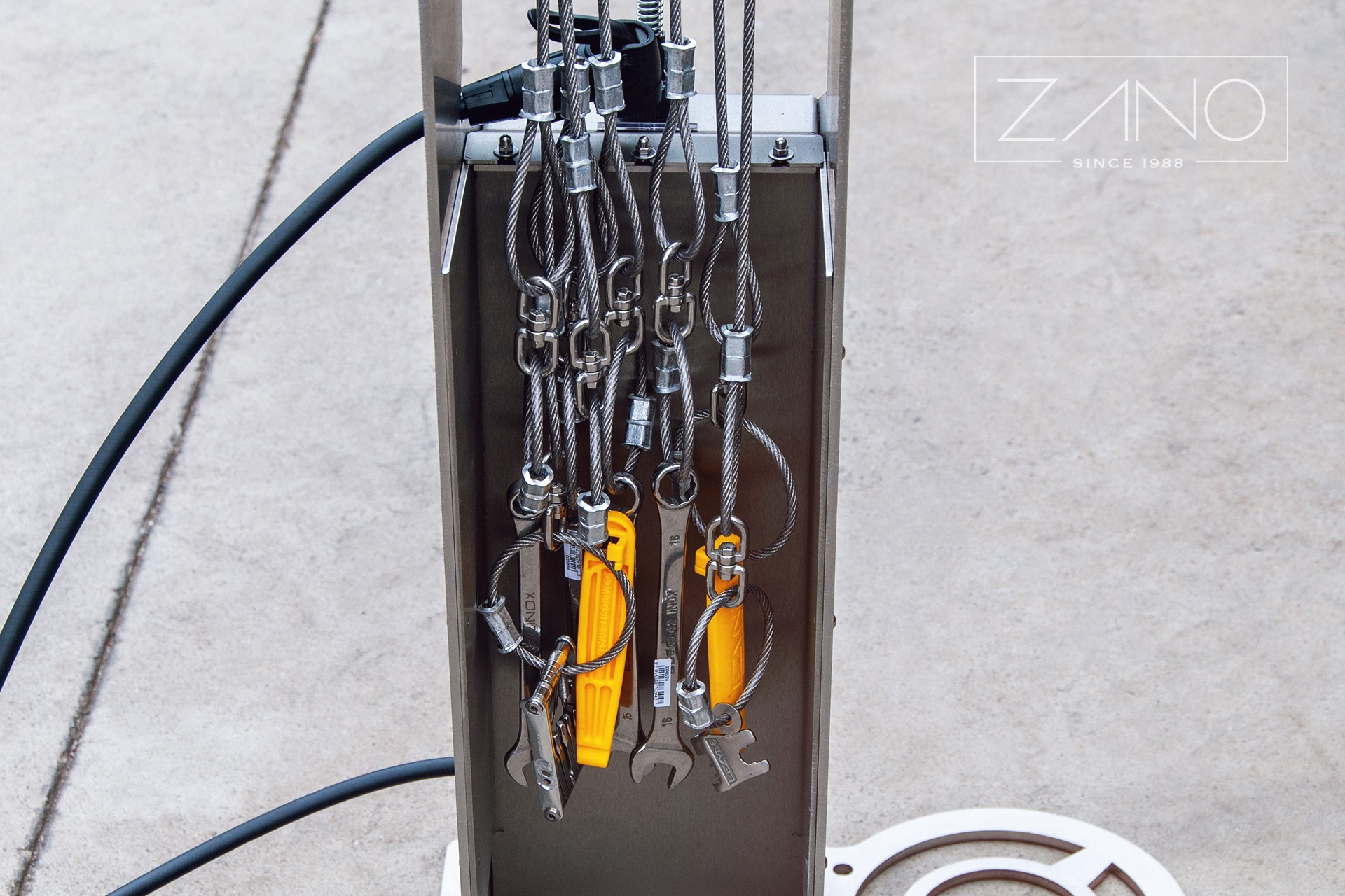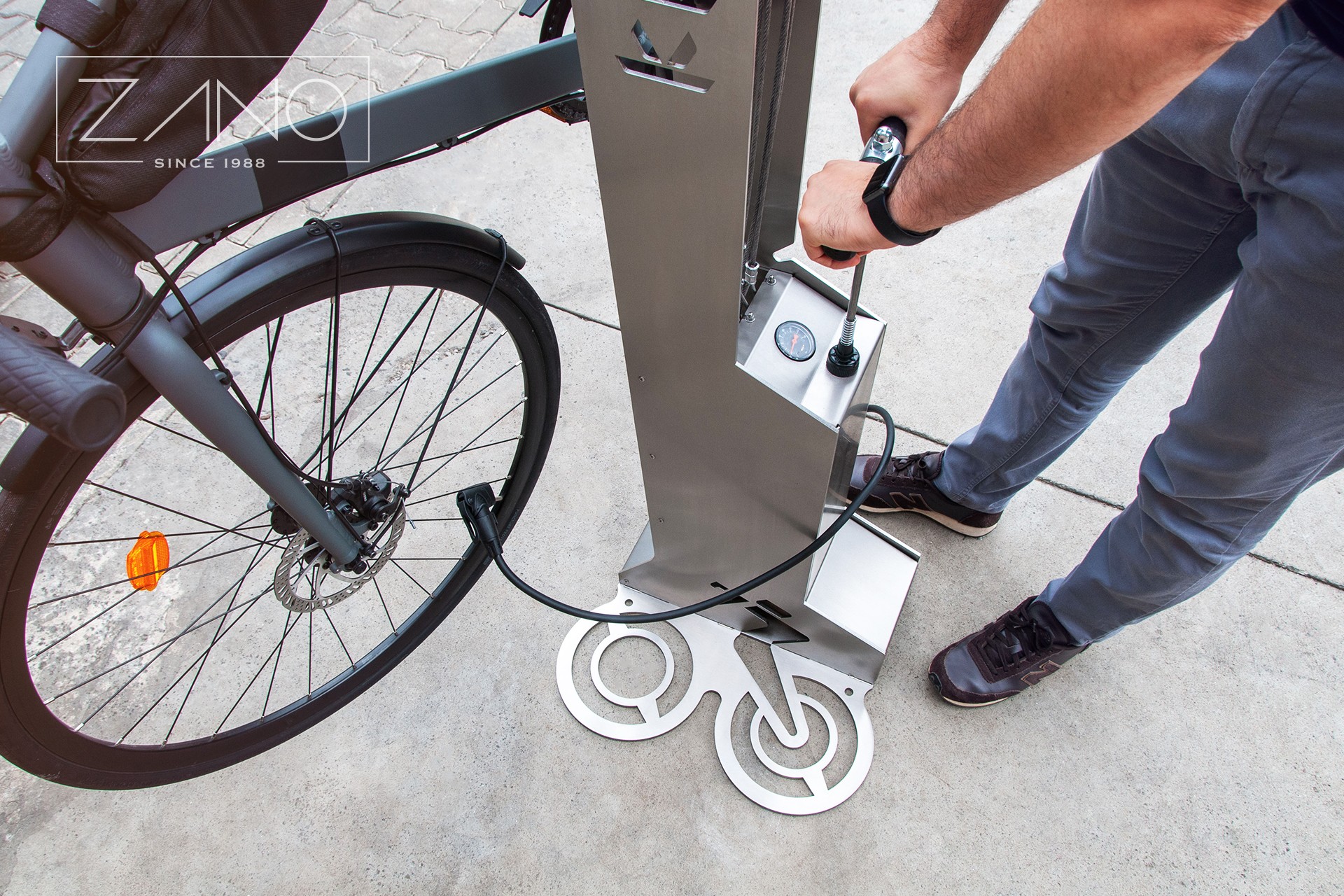 Savarankiško, avarinio dviračių remonto ir techninės priežiūros stotis, kurioje įrengtas dviračių laikiklis, galinis dviračių stovas, grindų siurblys su manometru ir įrankių rinkinys.