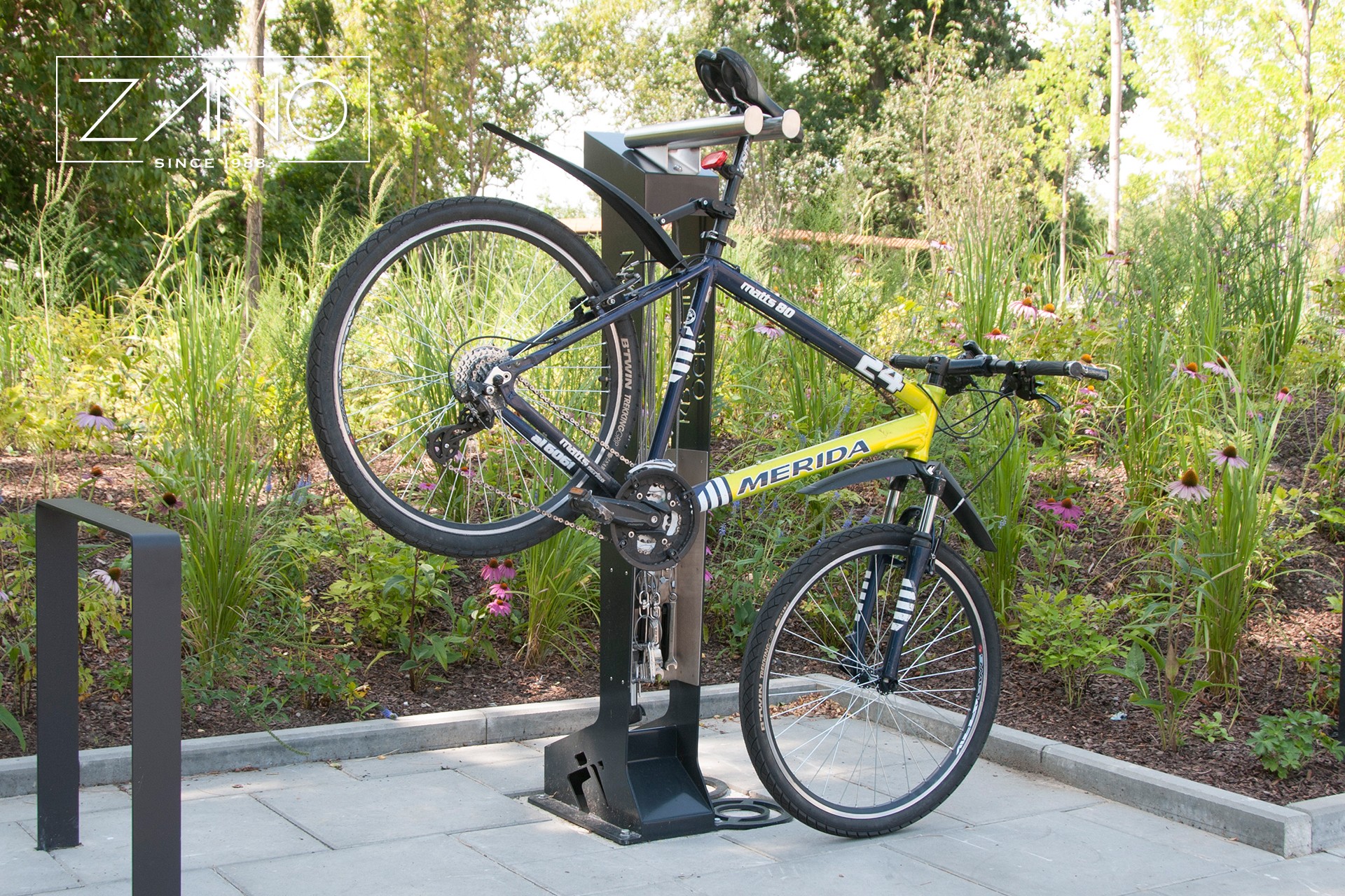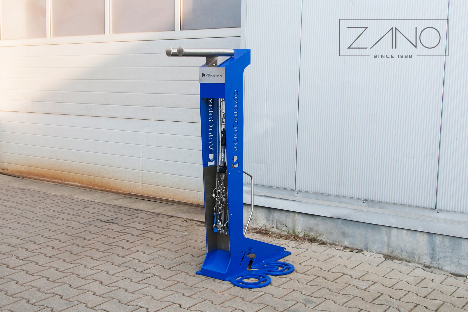 Savarankiško, avarinio dviračių remonto ir techninės priežiūros stotis, kurioje įrengtas dviračių laikiklis, galinis dviračių stovas, grindų siurblys su manometru ir įrankių rinkinys.