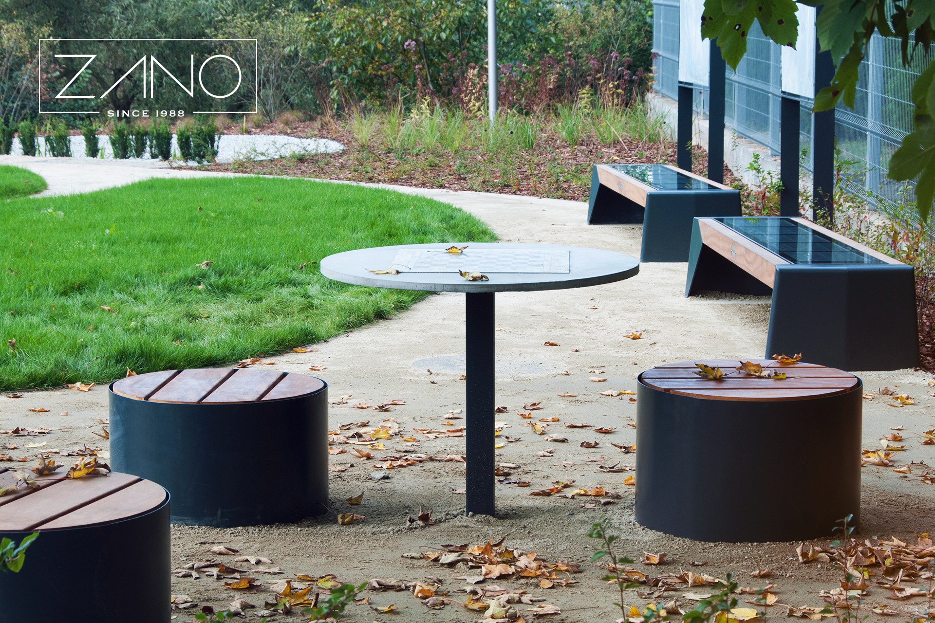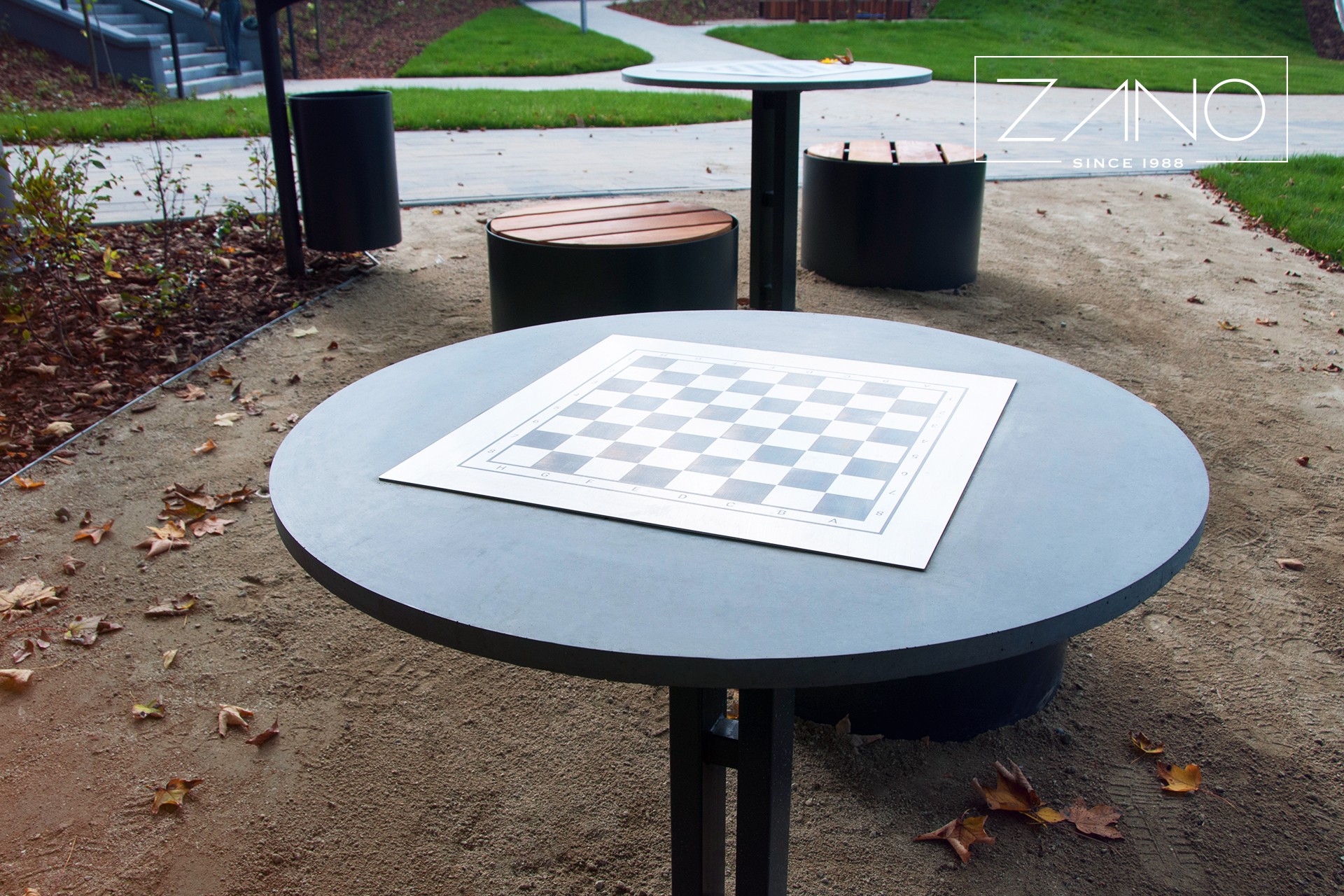 Autobusų lentelė. Jis turi betoninę viršutinę dalį, ant kurios galima pastatyti pasirinktą šachmatų ar kinų žaidimą. Žaidimo lenta ant betono paviršiaus atspausdinama UV spinduliais arba išgraviruojama plieninėje plokštelėje, kuri įdedama į atitinkamą įdubą betono viršuje. Stalviršis laikosi ant plieninės konstrukcijos. Galite rinktis stalą iš anglinio plieno, dažyto milteliniu būdu pagal RAL spalvą arba nerūdijančio plieno.