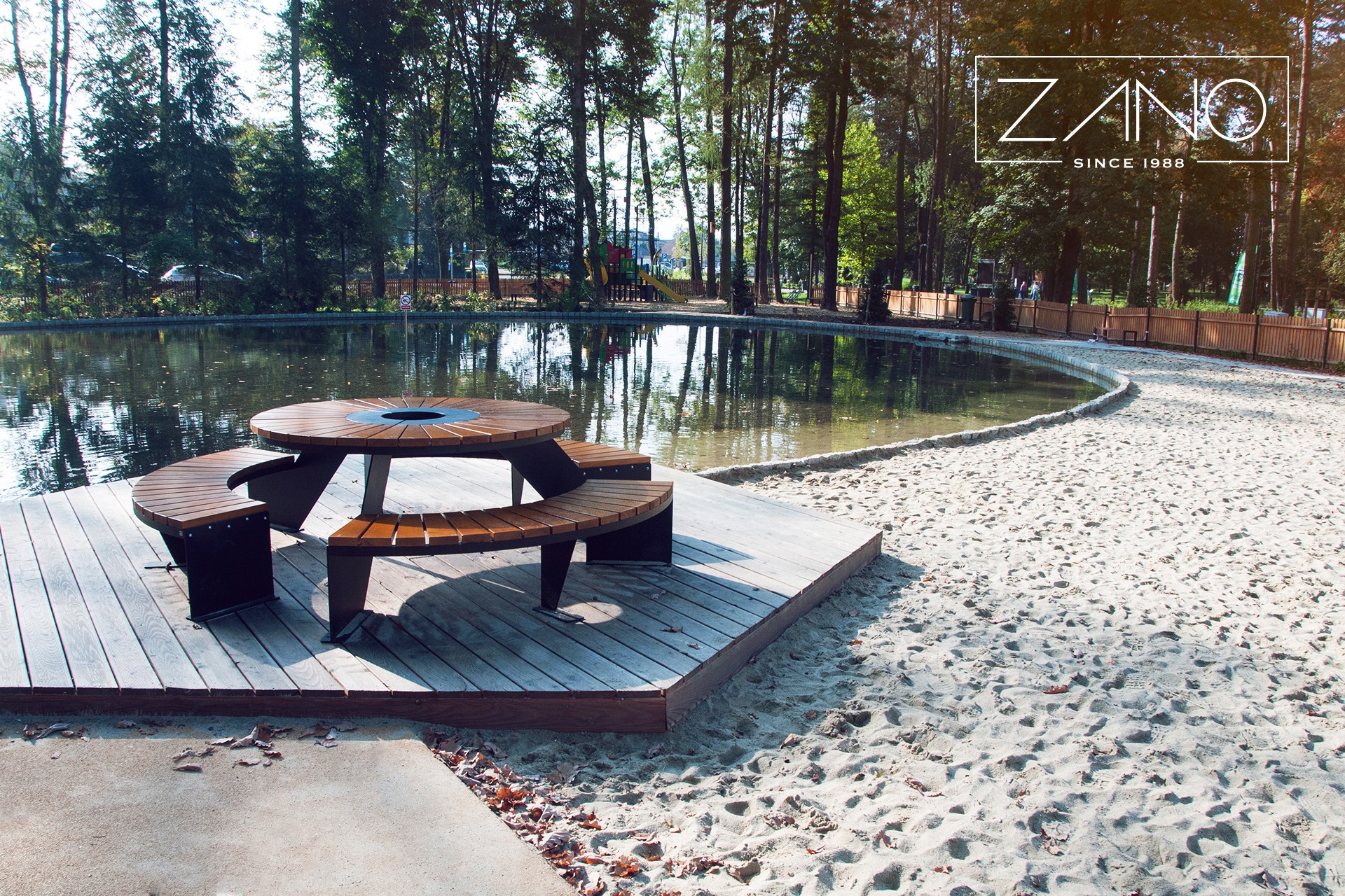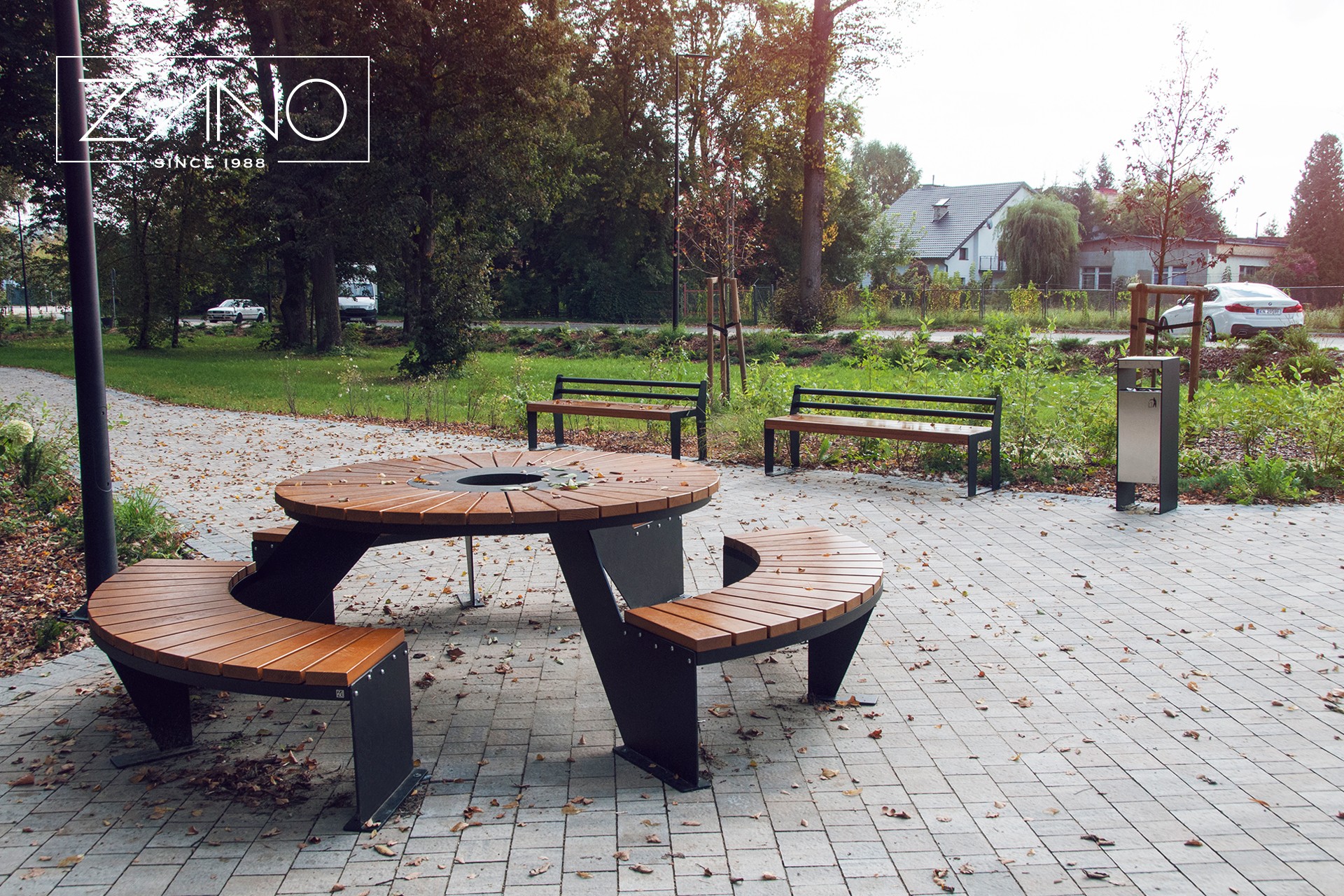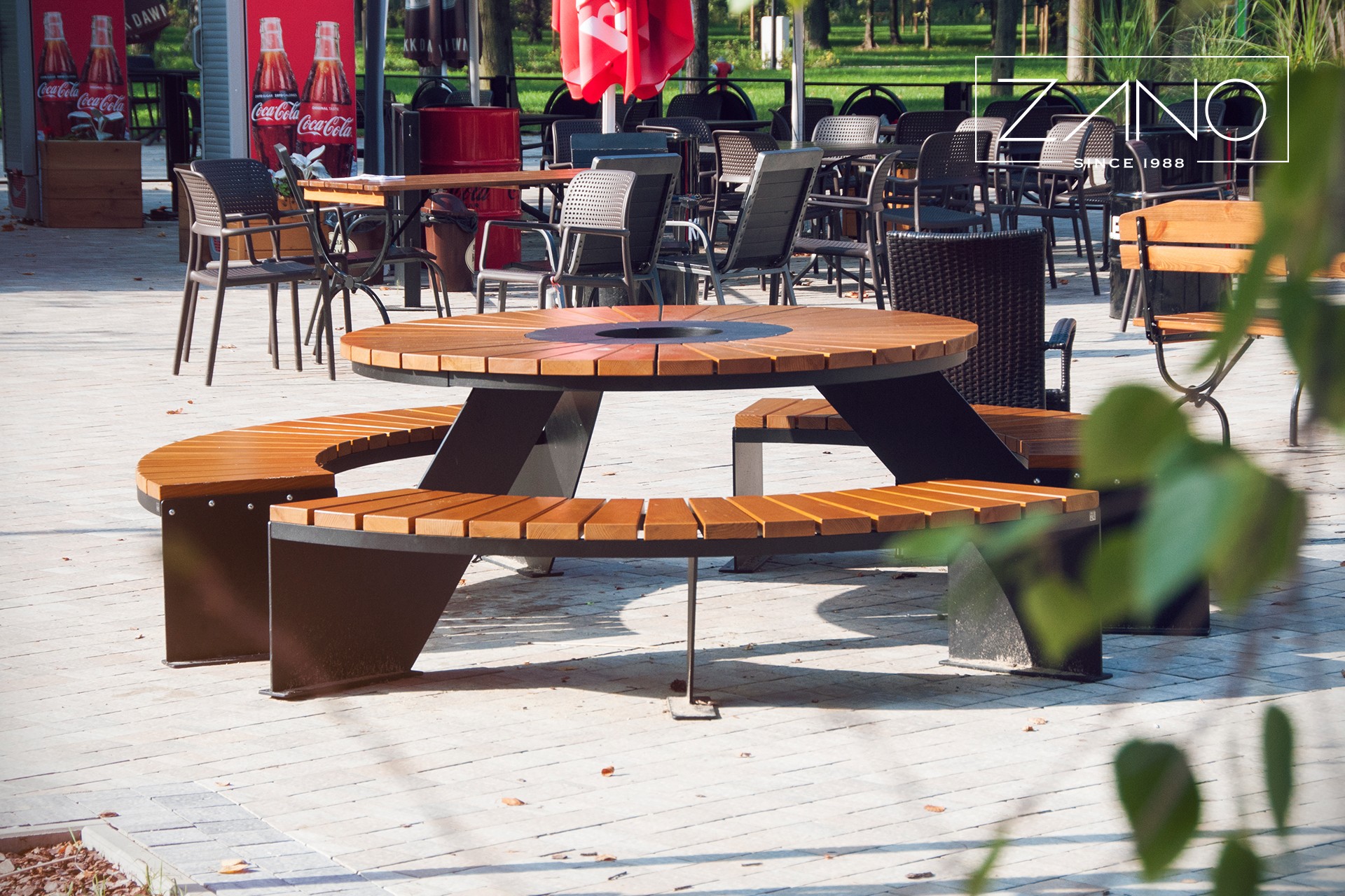 Modernus "Domino" pikniko stalas puikiai dera su kitais "Domino" serijos gaminiais. Plieno ir medžio elementų konstrukcija sukuria harmoningą modernaus dizaino ir tradicinio pikniko stalo derinį. Apskritos formos "Domino" stalas gali būti pritaikytas 9 žmonėms, o stalviršio centre esančioje skylėje galima pritvirtinti skėtį. "Domino" pikniko stalas gali būti įvairių variantų. Galime naudoti juodą plieną (dažytą bet kuria RAL spalva) arba nerūdijantį plieną, o mediniai elementai gaminami iš vietinės arba egzotinės medienos. Stalas gali stovėti kaip laisvai pastatomas baldas arba gali būti pritvirtintas prie žemės naudojant plėtimosi varžtus.