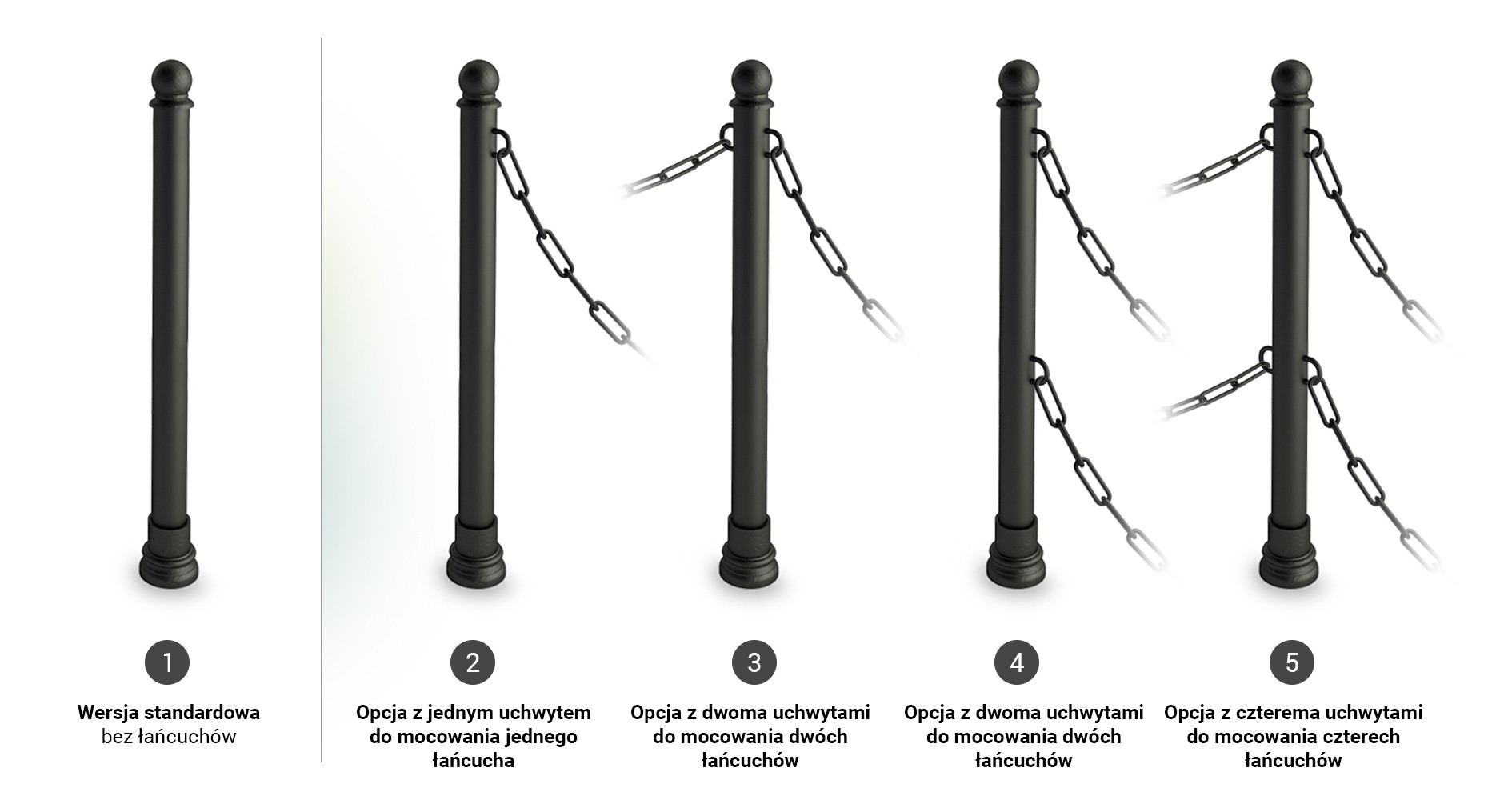 Parduodami dviejų tipų gatvių stulpelius jungiančios grandinės: Klasikinė grandinė Coral ir Dekoratyvinė grandinė Solid. Priklausomai nuo jūsų poreikių, yra penkios stulpelio su grandinėmis konfigūravimo galimybės. 1 galimybė - stulpelis be grandinių (numatytasis variantas), 2 galimybė - stulpelis su viena ausimi grandinei, 3 galimybė - stulpelis su dviem ausimis grandinei abiejose stulpelio pusėse, 4 galimybė - stulpelis su dvigubu grandinės tvirtinimu vienoje pusėje, 5 galimybė - stulpelis su dvigubu grandinės tvirtinimu abiejose stulpelio pusėse. Toliau pateiktoje iliustracijoje pavaizduotas " Bene" posto pavyzdys.